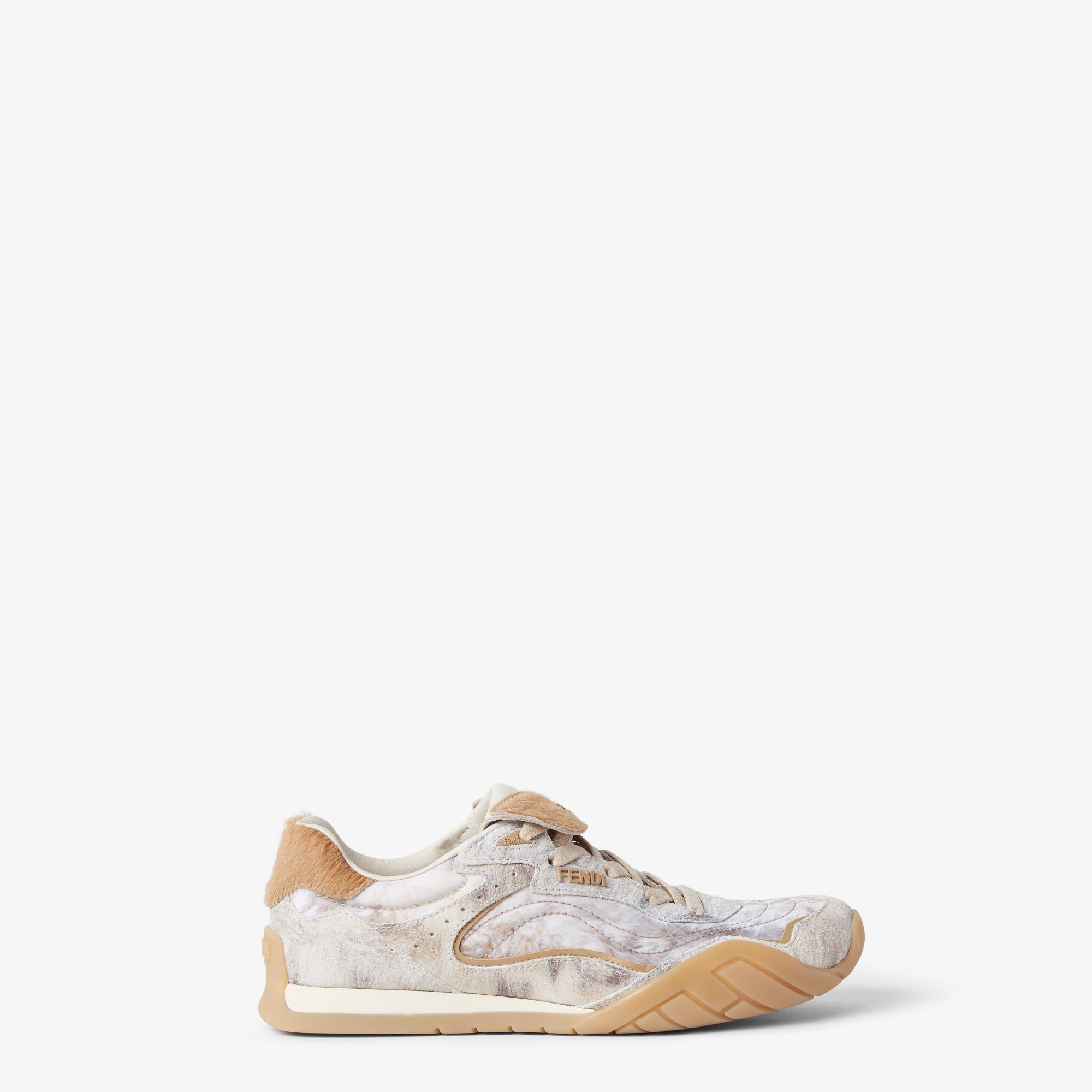 • Бежевая беговая резиновая подошва с боковым кантом и диагональным мотивом F