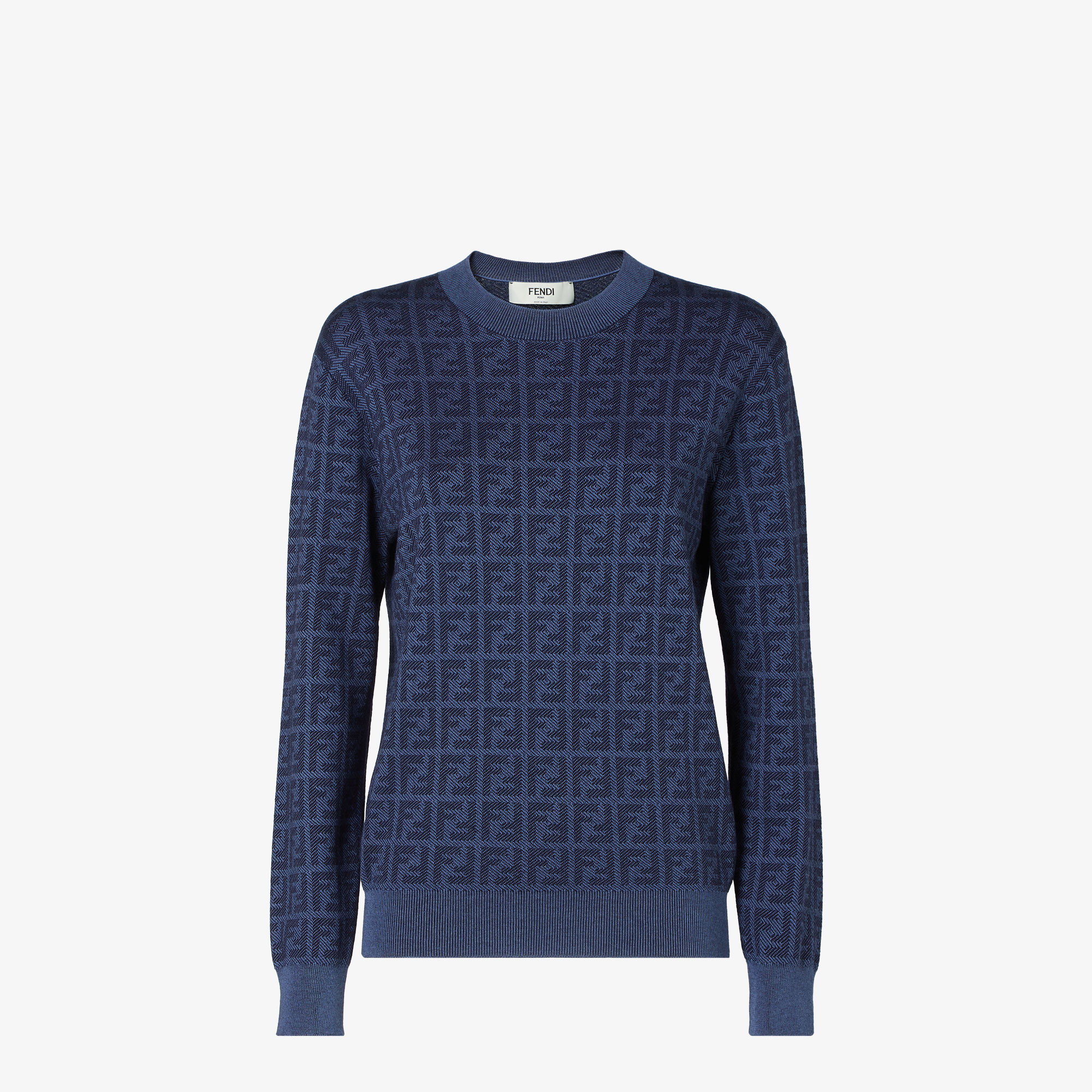 • Жаккардовое плетение с культовым мотивом FF по всей поверхности в тёмно-синем «джинсовом» стиле